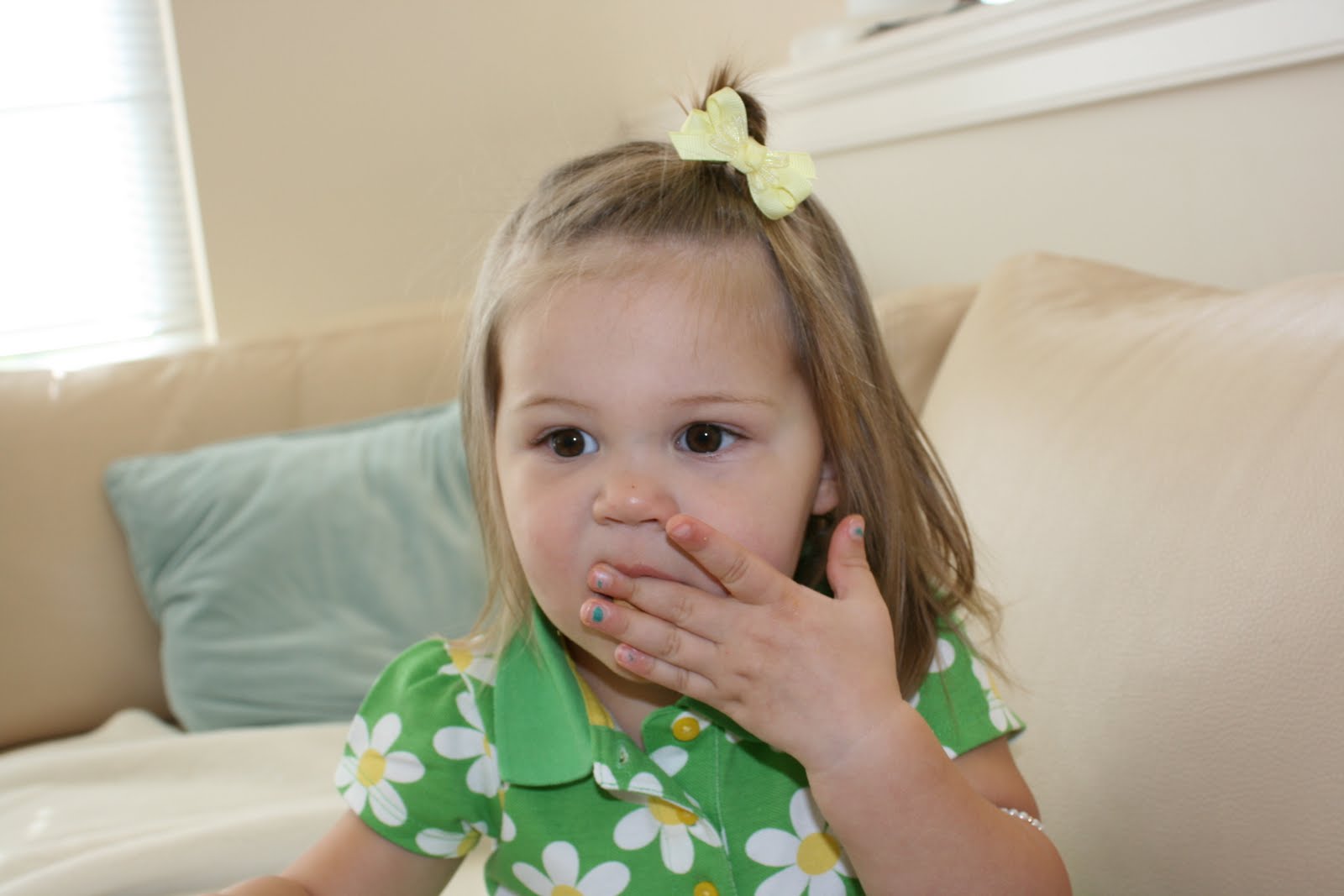 Teagan playing with her sunhat in the room